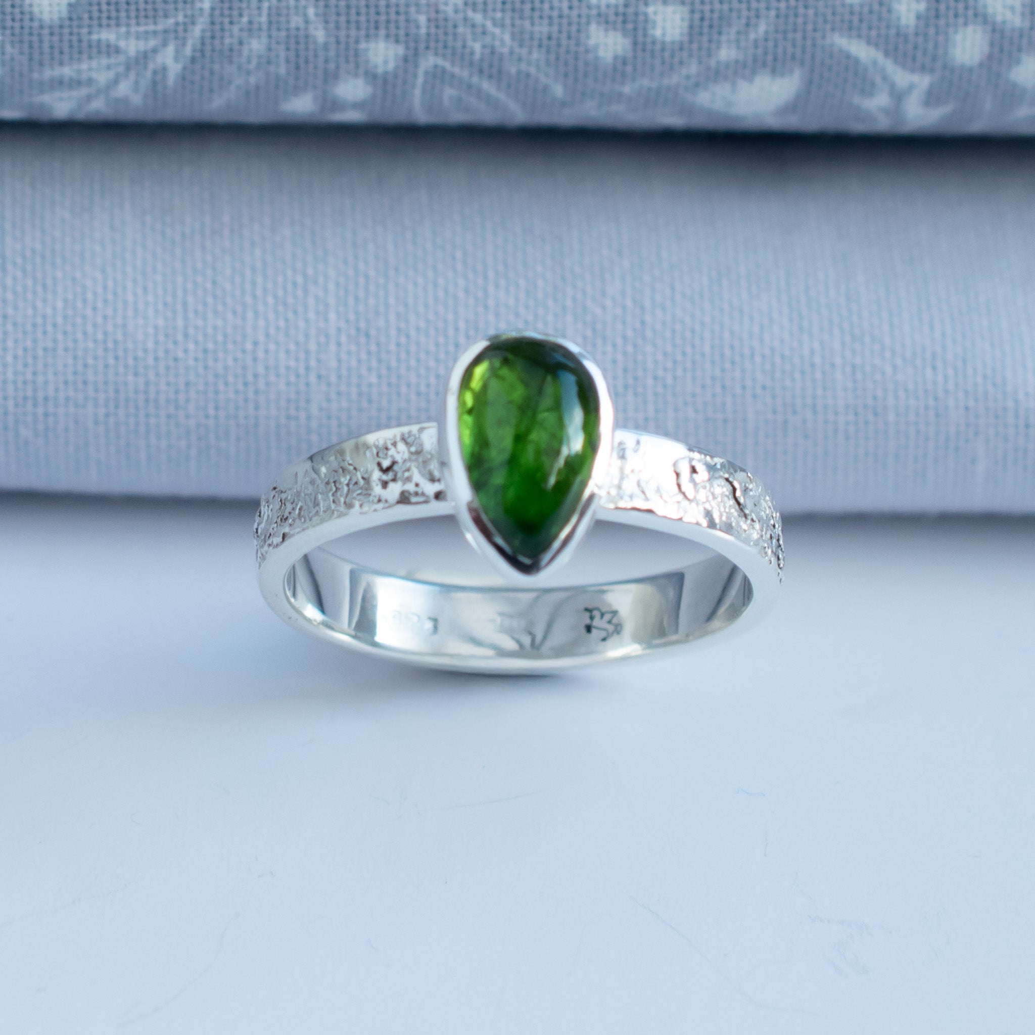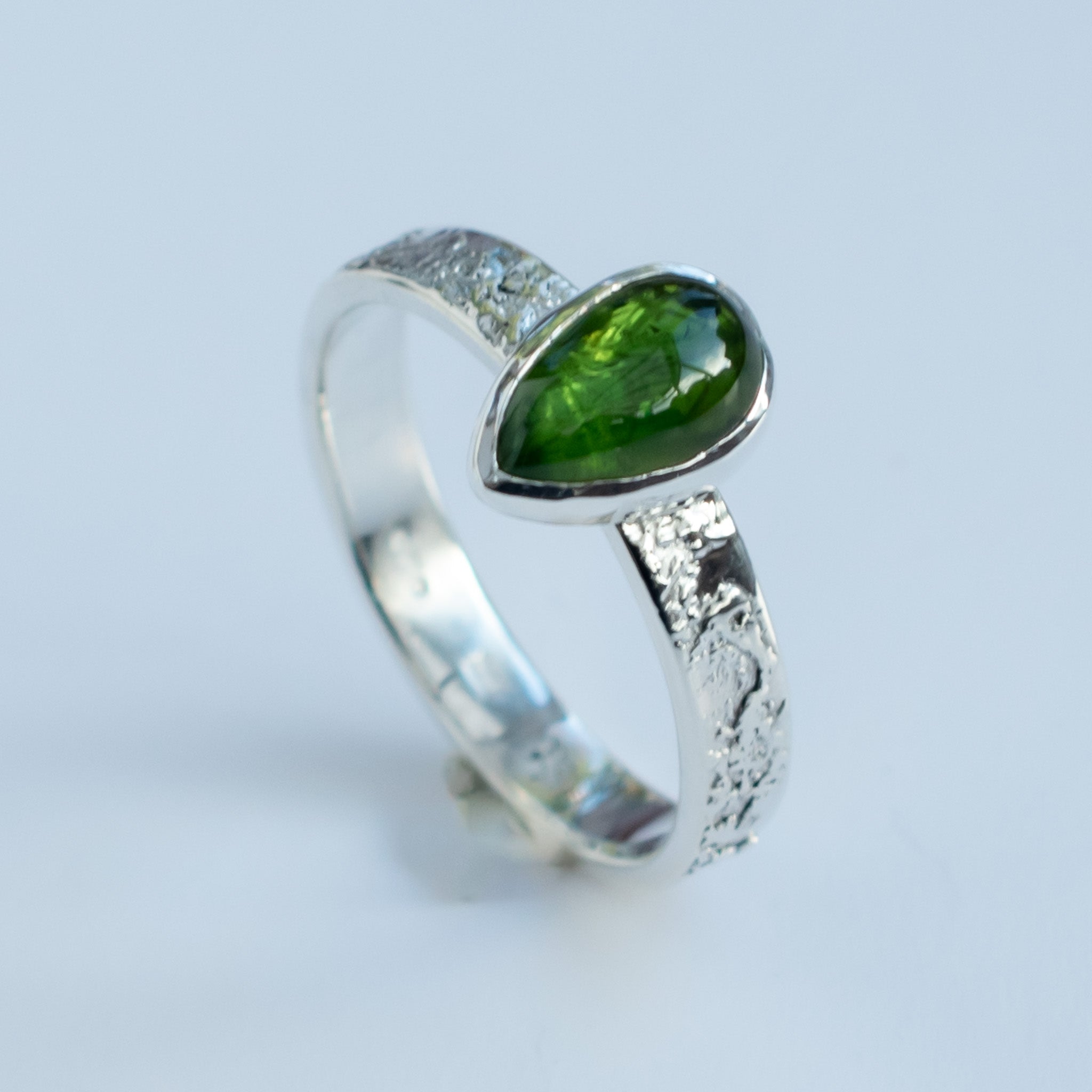 This one-of-a-kind Green Tourmaline ring is handcrafted in premium Argentium Silver and set with a deep green pear-shaped gemstone full of natural character and depth. The setting features a subtle silver dust texture that contrasts beautifully with the highly polished mirror-finish band, creating a ring that feels both organic and refined. Designed and made entirely by hand, this is a distinctive statement piece for someone who appreciates unique gemstones and contemporary silverwork.