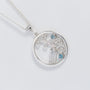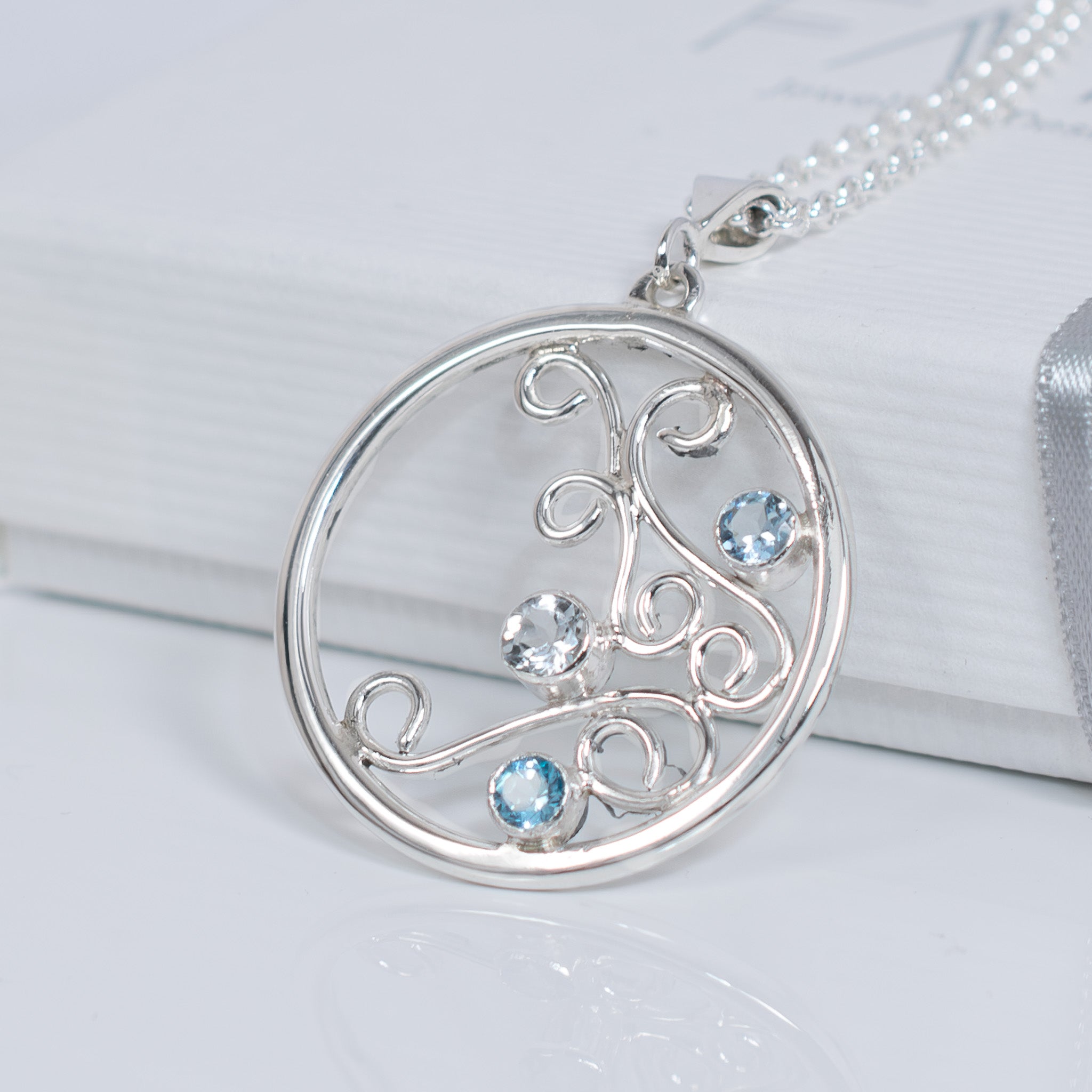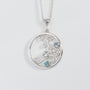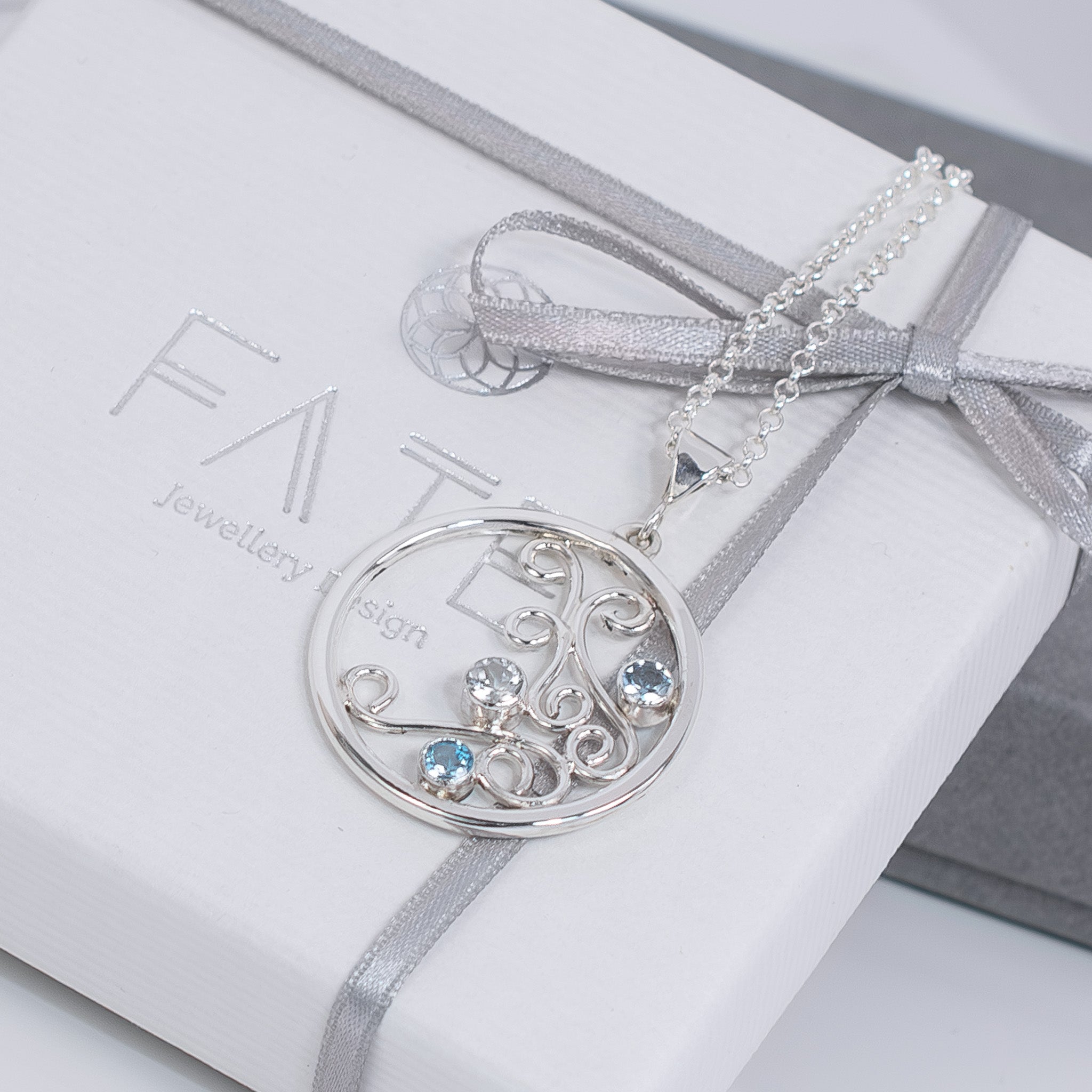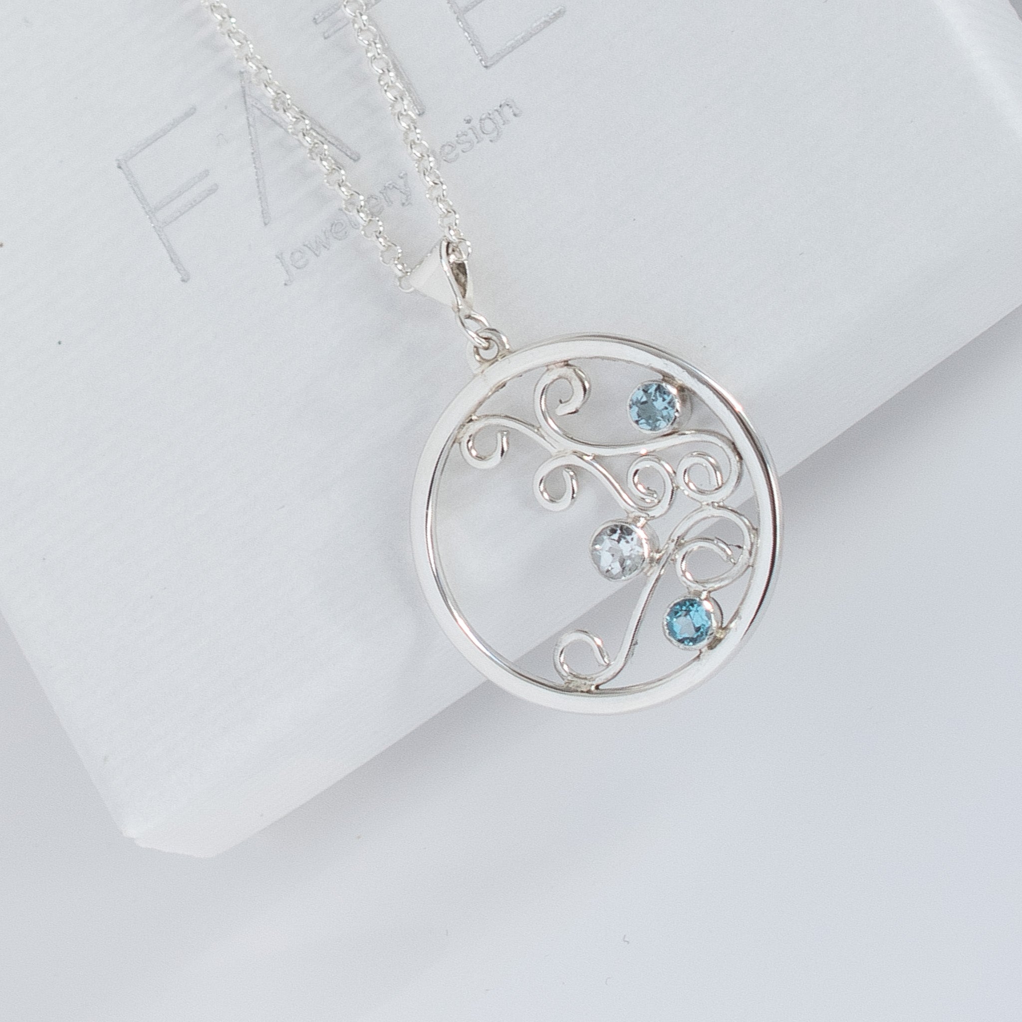 A Limited Edition Sterling Silver pendant set with beautiful natural gemstones which include Aquamarine, the birthstone for March babes, Apatite & White Topaz. The pendant stands out with its statement size while keeping a delicate appeal with soft swirls of silver to make a feminine statement and to compliment your look.